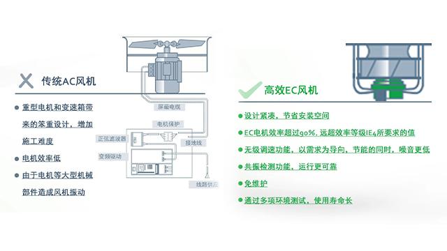 傳統AC風機都具有重型的電機和變速箱,這樣的設計顯得很笨重,增加了施工的難度,電機的效率也很低,并且大型的電機等機械組件還會造成風機的振動,很影響冷卻塔的工作效率。而空調冷卻塔風機采用的是綠色科技EC電機,這種設計更加緊湊,并且節省安裝的空間。EC電機效率遠超普通大型電機90%,并且還具備無級調速功能,在節能的同時,工作噪音更低,安裝維護更便捷,使用壽命更長。